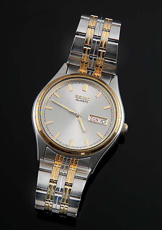 Seiko Quartz. Gehäuse und Armband mit Faltschließe Stahl vergoldet. D 37 mm. Silberfarbenes Zifferblatt, goldene Ziffernstriche, Leuchtzeiger, Zentralsek., Datum und Wochentag. Quartzwerk, gangbar. Gebrauchsspuren (Glas etwas verkratzt, Armband und Gehäuseboden mit Tragespuren).