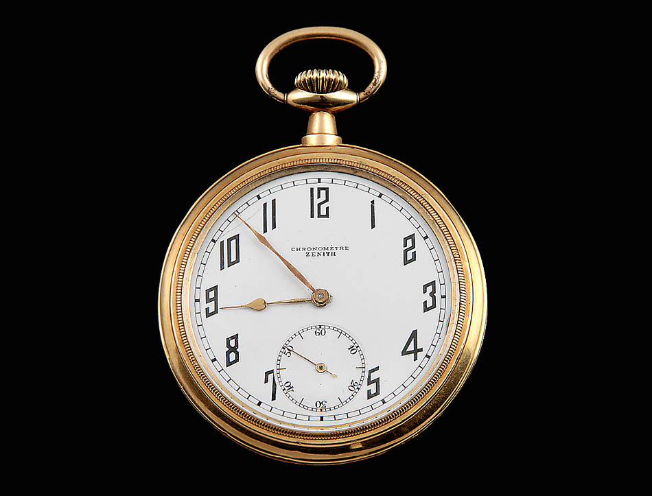 1. Drittel 20. Jh.. Chronomètre Zenith. Gehäuse GG 14 ct. D 49 mm. Emailzifferblatt (zwischen 10 und 11 ein schwacher Haarriss), arab. Ziffern, kleine Sek. bei 6, Goldzeiger. Handaufzug, gangbar. Nur mäßige Gebrauchsspuren. Gewicht einschließlich Werk und Glas 80 g.