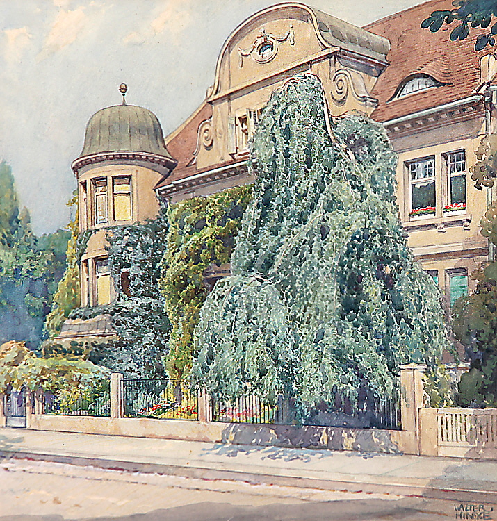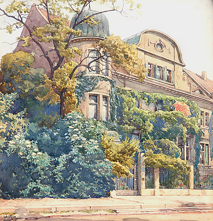 1875 Leipzig 1959; deut. Maler und Grafiker. Zwei Aquarelle: Ansichten einer alten Villa in Leipzig. Jeweils sign. Walter Hinze. Ca. 33 x 32 cm (Bildausschnitte). Passepartouts, vergl. RR..
