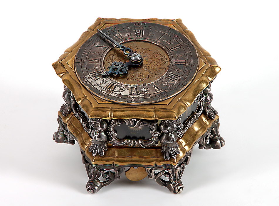 19. Jh.(?). Sechseckiges Messinggehäuse mit reicher Reliefzier und verglasten Kartuschen. Versilberter Ziffernkranz mit röm. Ziffern und arab. 5-Minutenangabe, durchbrochene Eisenzeiger. Auf dem Zifferblatt bez. „Heiliger Danzink“. Werk mit Schlüsselaufzug, Rufschlagwerk mit Repetition für volle Stunden auf am aufklapparen Boden angebrachter Glocke, gangbar. H 9,6 cm.