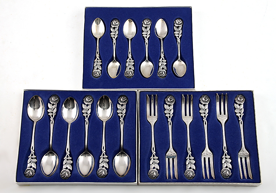 6 Kuchengabeln, 12 Teelöffel. 100er Feinsilberauflage. Dekor: Hildesheimer Rose. Orig. Pappschachteln.
