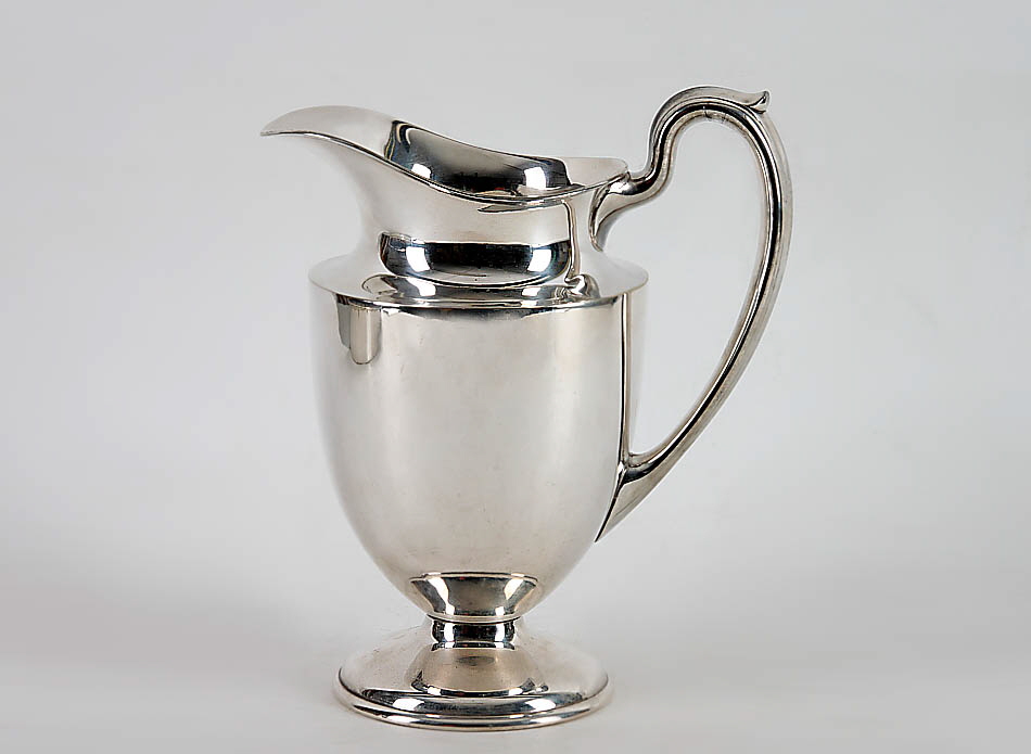 USA. Metall versilbert. Bauchiges Schultergefäß, runder, gewölbter Fuß, kurzer Hals mit geschwungener Schnauze, Ohrenhenkel. H 26,5 cm.