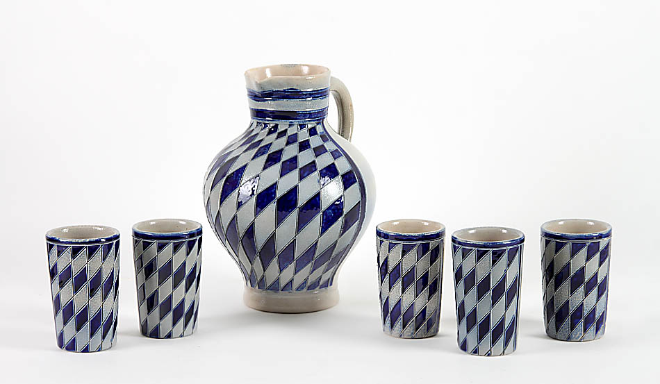 Westerwald, Höhr-Grenzhausen, Reinhold Merkelbach, am Kannenboden Pressmarke. Bauchige Kanne mit kleiner Schnauze und unten spitz abgestrichenem Henkel, konische Becher. Salzglasiertes Steinzeug, geritztes blaues Streifen- und Rautenmuster. Kanne: H 26 cm, Becher: H 11,5 cm.