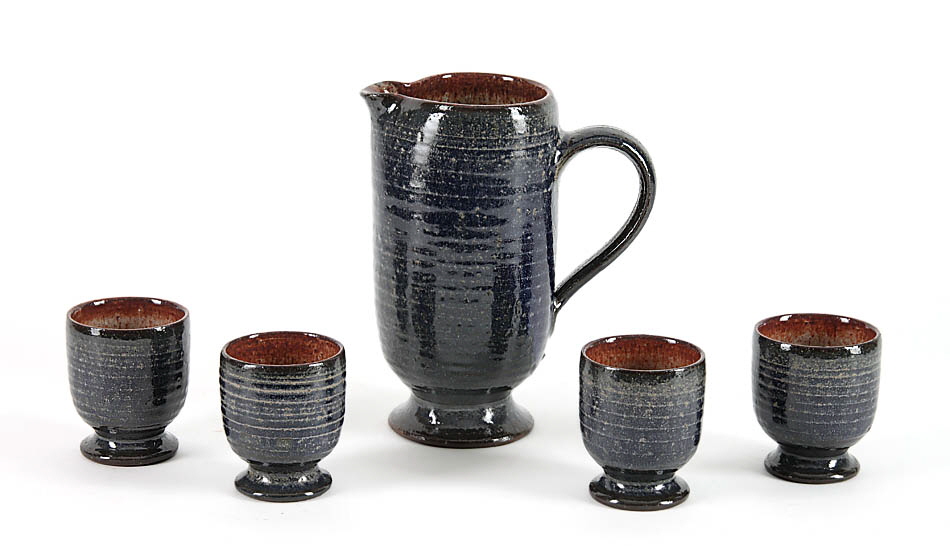 Westerwald, Höhr-Grenzhausen, Rudi Stahl. Jeweils sign. Rudi Stahl. Salzglasiertes Steinzeug, Glasuren blau, braun, grau. Kanne: H 21 cm, Becher: H 8,5 cm.