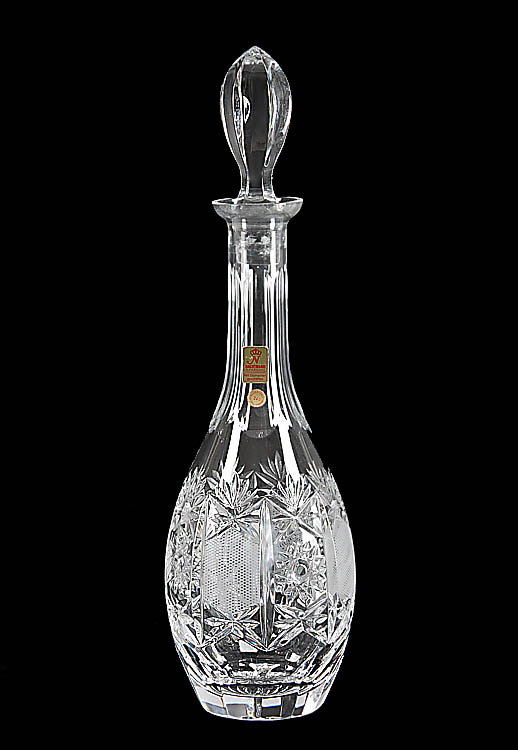 Glasmanufaktur Nachtmann. Bauchiger Gefäßkörper, Röhrenhals mit runder Lippe, kantig geschliffener Stöpsel. Bleikristall, feiner Kerb- und Steinelschliff, im Boden Sternschliff. H 38,8 cm.