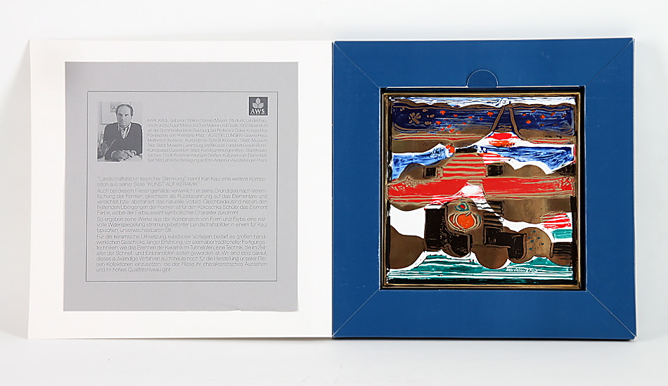 *1934 Oberelz/Mayen. Studium der Malerei und Grafik an den Landesbau- und Kunstschulen in Mainz und Trier. 1962 Stipendium an der Sommerakademie Salzburg bei Oskar Kokoschka. Zahlreiche nationale und internationale Ausstellungen. „Landschaftsbild in feierlicher Stimmung“. Farbdruck auf Keramikplatte, in der Platte sign. Karl Kaul, dat. (19)87. 20 x 20 cm. In orig. Papierkassette (Gebrauchsspuren).