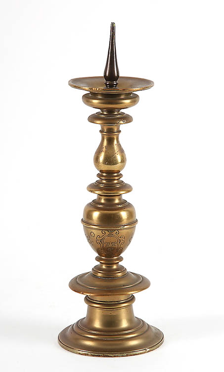 Italien. Gelbguss. Auf dem gegliederten Balusterschaft Adelswappen der Familie Celli aus Pistoia, bez.: „JS Zelli, 1599“. H mit Dorn 34,5 cm. Provenienz: ehem. Sammlung des Kunstsammlers und Industriellen Prinz Demidoff von Donato. Der Leuchter wurde 1979 bei dem bedeutenden Gelbguss-Spezialisten und Verfasser des Buches „H. P. Lockner, Messing, 15.-17. Jahrhundert“, München 1982, H. P. Lockner, Würzburg, erworben. Jetzt: rheinische Privatsammlung.