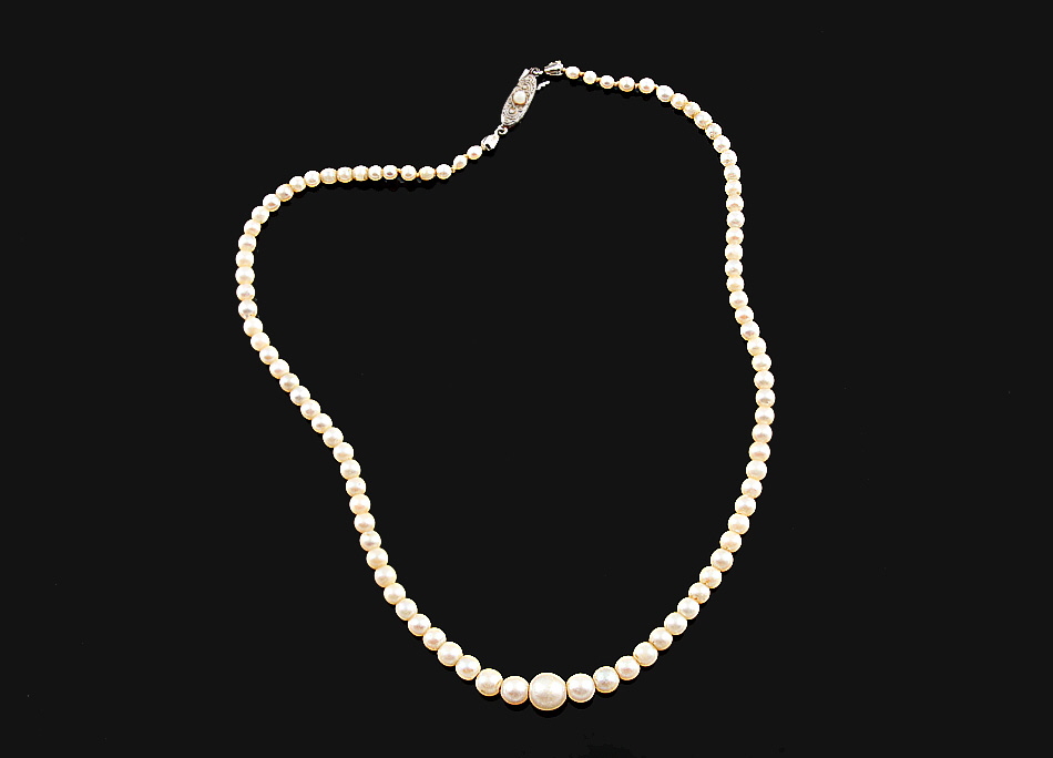 Zuchtperlen, verlaufend. D 3 mm – 8 mm. Schließe mit kleiner Zuchtperle GG 333. L ca. 41,5 cm.