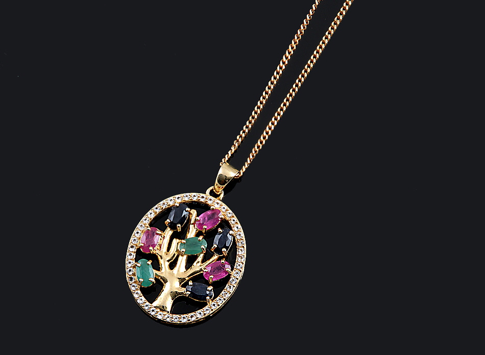 925er Silber vergoldet. Ovaler, durchbrochener Anhänger mit Rubinen, Smaragden, blauen Saphiren und Zirkonia. L ca. 3,2 cm. Dünne Gliederkette mit Ringösenschließe. Zus. 6,2 g brutto.