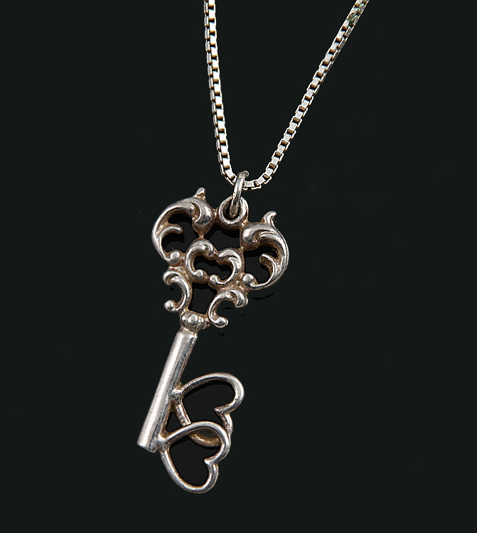 Siberanhänger in Form eines Schlüssels. L ca. 3,9 cm. Dünne Venezianerkette mit Ringösenschließe 835er Silber. Zus. 8 g.