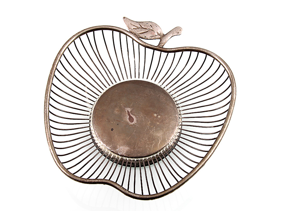 Form eines Apfels. Silberfarbenes Metall, Zierdurchbrüche. H 4,7 cm, L 18 cm.