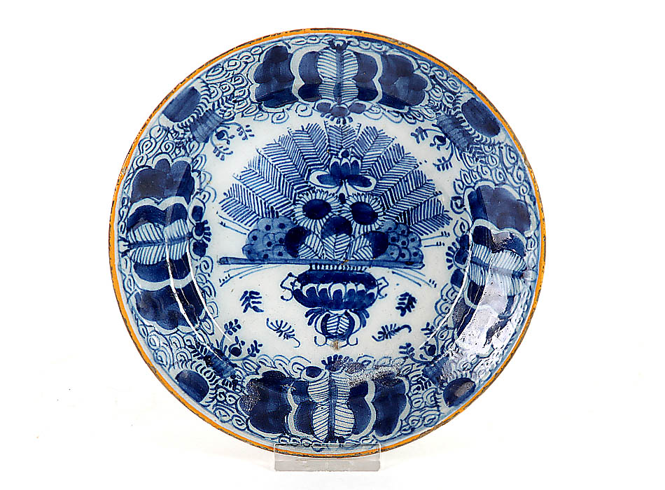 Holland, Delft, am Boden blaue Pinselmarke, 18. Jh.. Bläulichweiß glasierter Scherben, gelber Randstreifen, ugl. Blaumalerei. Im Spiegel Blumenschale mit Pfauenfedern, auf der Fahne Blumen- und Spiralrankenmuster. H 3,4 cm, D 16,6 cm.