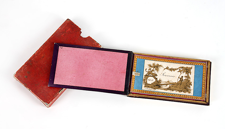 „Souvenir“. Titelbl. mit feiner Goldradierung. Widmungen, Sprüche und Datierungen 1840, 1841, 1842, 1846. Bll. mit Goldschnitt, orig. Pappmäppchen mit Goldborte, roter, orig. Pappschuber.