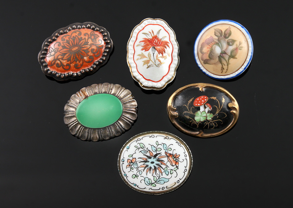 6 Porzellanbroschen. 1. Hälfte 20. Jh.. Bunte Blumenmuster u.a., gemalt und gedruckt.