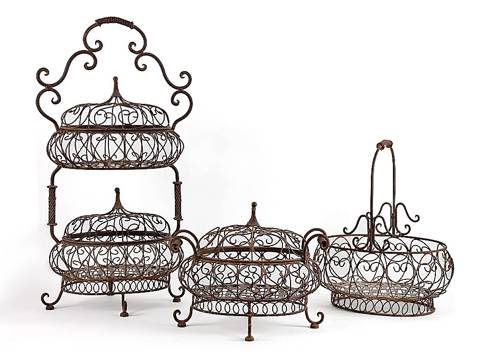 Drei Jardinieren. Schmiedeeisen und Eisendraht, rostfarbene Patina. H 35 cm, 50,5 cm, 83,5 cm.