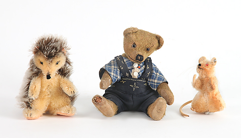 3 Stofftiere: Igel und Maus, Fa. Steiff mit Knopf im Ohr, 1 kleiner, sehr alter Teddybär mit alter Bekleidung, Fa. Steiff(?); eine Fußsohle etwas verschlissen mit sichtbarer Holzwollefüllung.