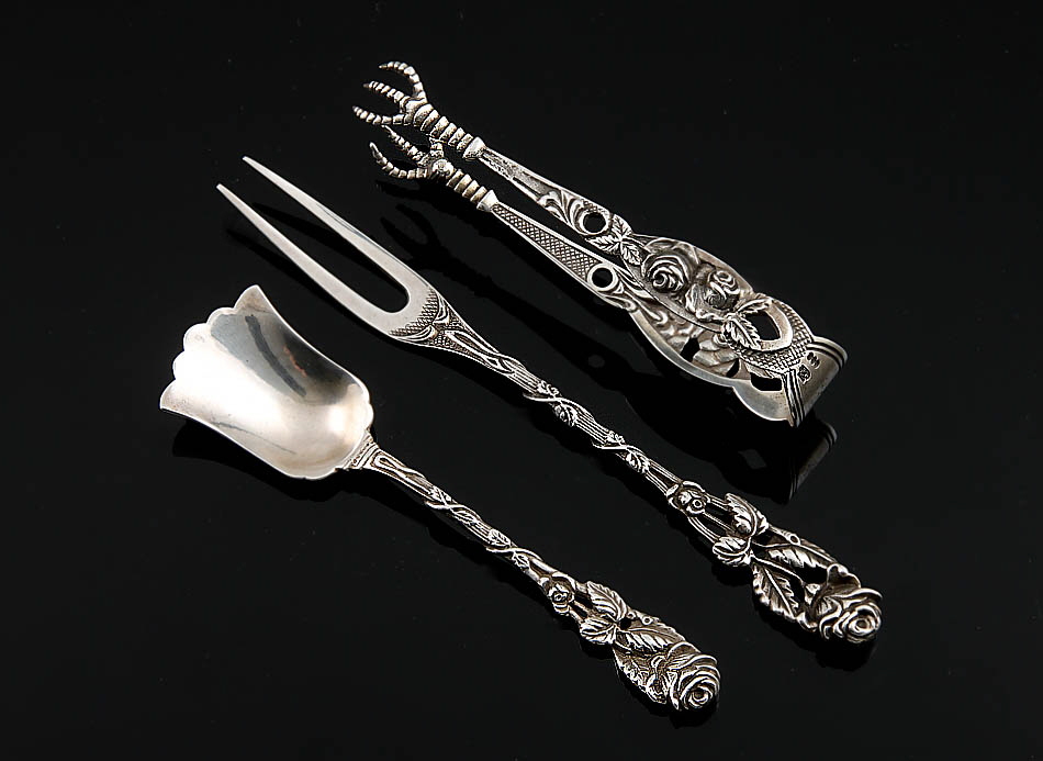 1 Zuckerzange, 1 Zuckerlöffel, 1 Vorlegegabel. 800er Silber, Rosenmuster. Zus. 47 g.