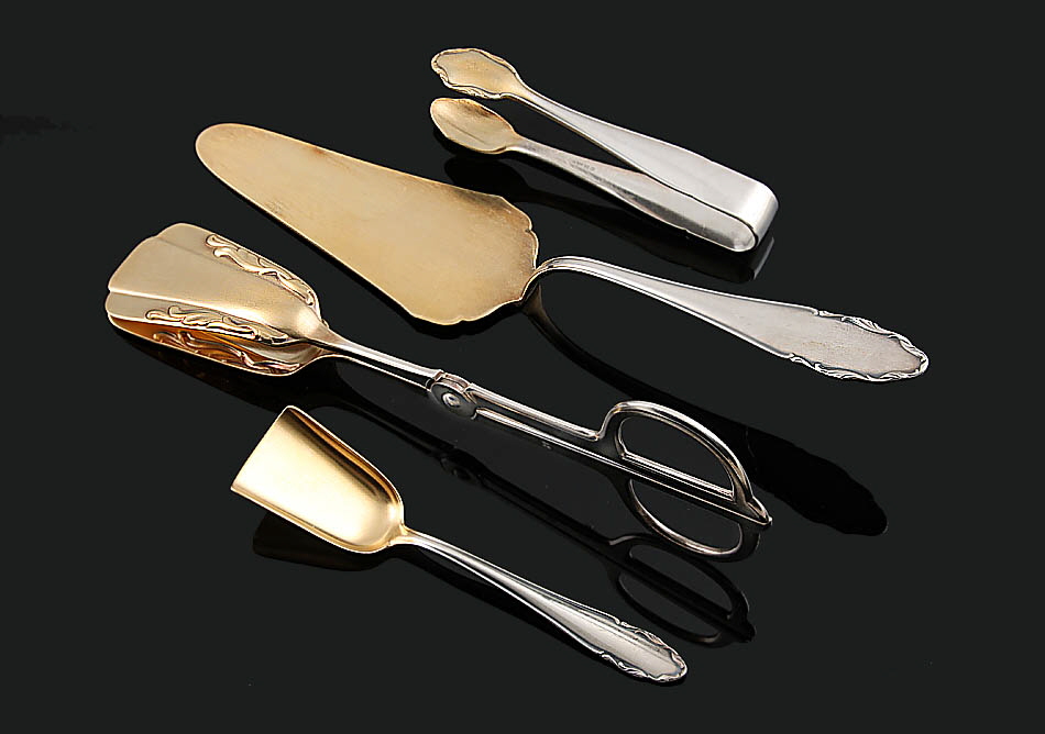 1 Gebäckzange, 1 Zuckerzange, 1 Zuckerlöffel, 1 Tortenheber. Metall versilbert, teilvergoldet.