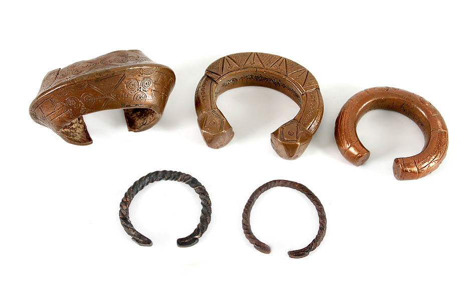 Fünf Manillen. Westafrika. Kupfer, Messing und Eisen. Wurden als Tausch- und Zahlungsmittel benutzt.