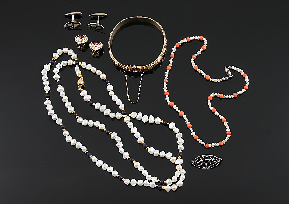 2 Ketten Zuchtperlen mit Lapis und Korallen, 1 vergoldeter Armreif, Paar Manschettenknöpfe, 800er Silber, Paar vergoldete Ohrclips mit rotem, herzförmigen Cabochon und Zirkonia, 1 silberfarbene Modebrosche mit Zirkonia.