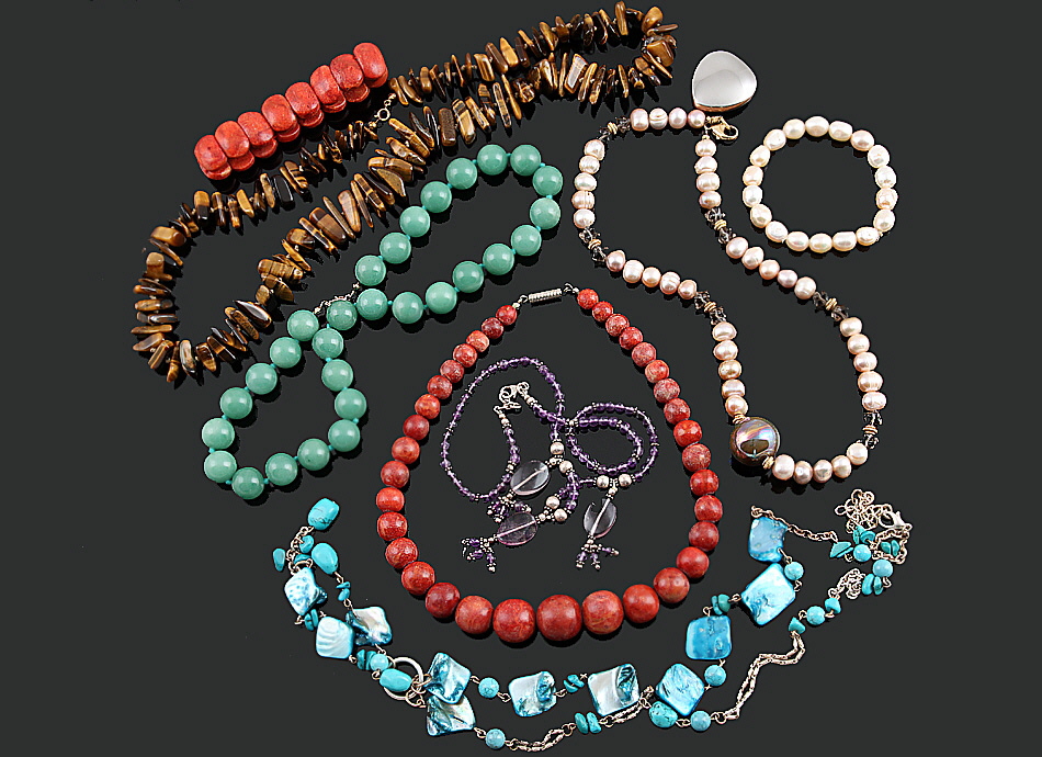 6 Halsketten mit verschiedenen Farbsteinen, 1 Armband aus Schaumkoralle, 1 Armband aus Zuchtperlen.