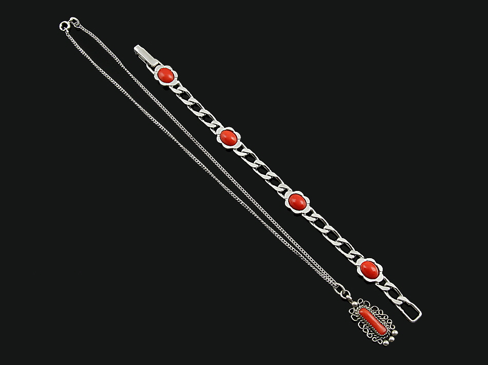1 Armband mit vier Korallencabochons, 835er Silber, 1 Silberanhänger mit Koralle und Kette, 835er Silber.