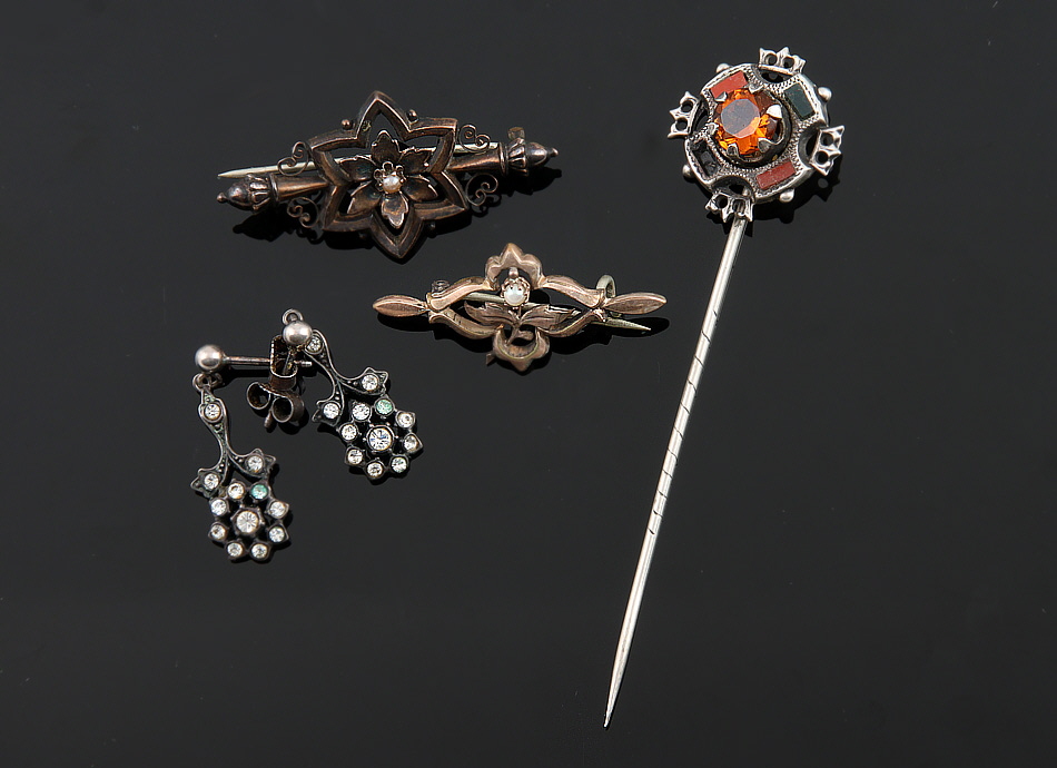 1 Reversnadel, 2 Broschen, Paar Ohrringe. Mit Farbsteinen und Süßwasserperlchen.