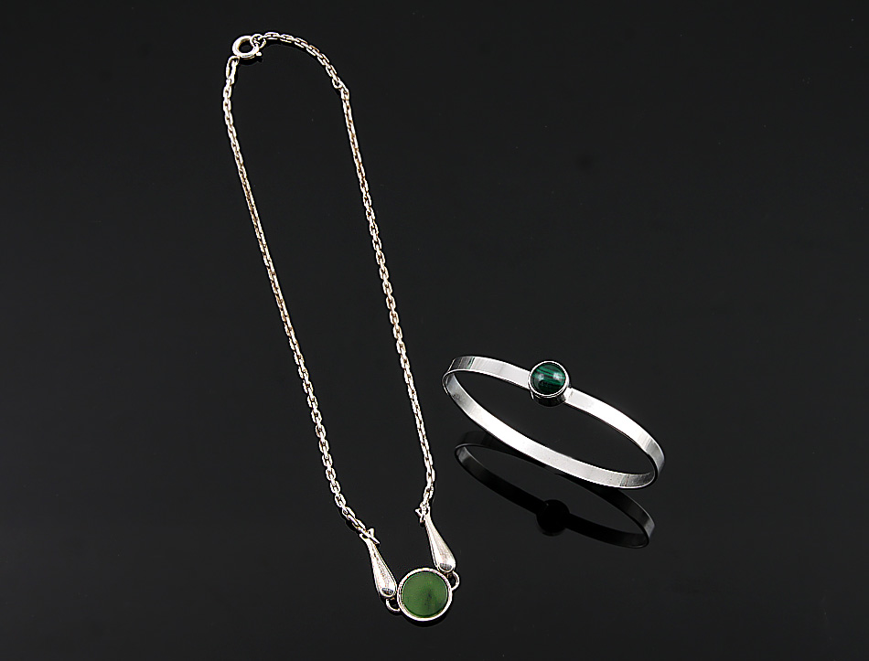 1 Armreif mit Malachitcabochon, 1 Collier mit Grünachat.