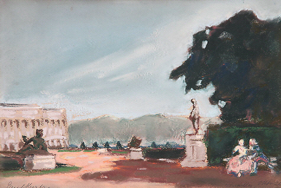 1900 Düsseldorf – 1988 Bad Hönningen; deut. Landschafts- und Bildnismaler. Studium an der Düsseldorfer Akad.. „Versailles“. Li. u. sign. Paul Kurtz, re. u. dat. Versailles Okt. (19)26. Bunte Pastellkreide/Papier, ca. 17 x 25,5 cm (Bildausschnitt). Passepartout, vergl. R..