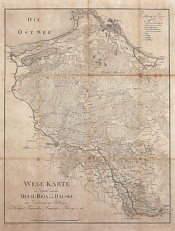 „Wege-Karte der Gegend zwischen Mitau, Riga und Bauske“. 48,5 x 37,4 cm. Altersfleckig, mehrere Knickfalten stellenweise mit kleinen Einrissen. Vergl. R..