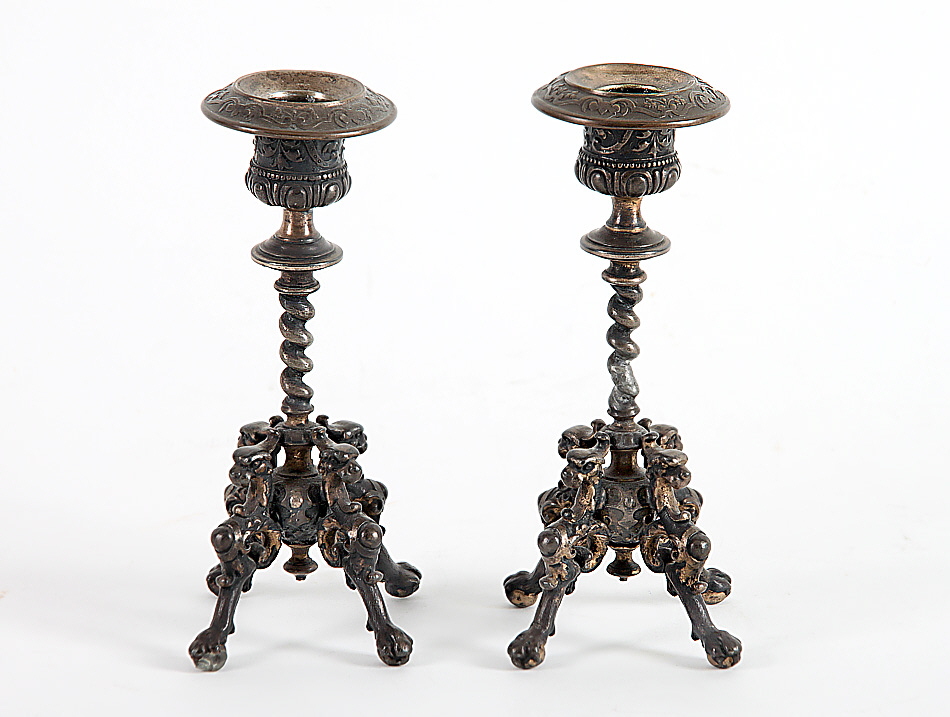 Historismus. Dunkelgrau patiniertes Metall. H 17 cm. Ein gedrehter Schaft unten mit alter Lötstelle, ein Tüllenrand etwas verbogen.