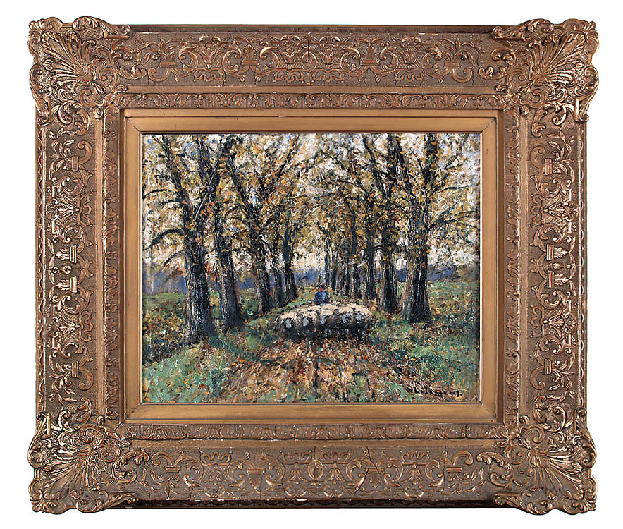 1858 Duisburg – 1945 Leipzig; deut. Landschafts-, Städte- und Marinemaler und Radierer, Prof.. Studium an der Düsseldorfer Akad. bei E. Dücker, P. Janssen und E. Forberg, Weiterbildung in Paris. Mitglied des Künstlervereins ‚Malkasten‘. „Schäfer mit seiner Herde in herbstlicher Landschaft“. Re. u. sign. H. Liesegang. Öl/Lwd., 40,5 x 51 cm. Stuckr. (etwas best.).