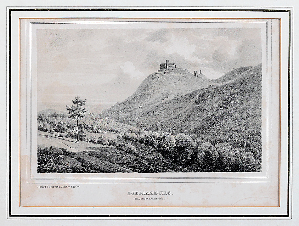 „Die Maxburg“. Auf Stein gezeichnet von F. Hohe. 14,5 x 22,8 cm. Stockflecken. Passepartout, vergl. R..