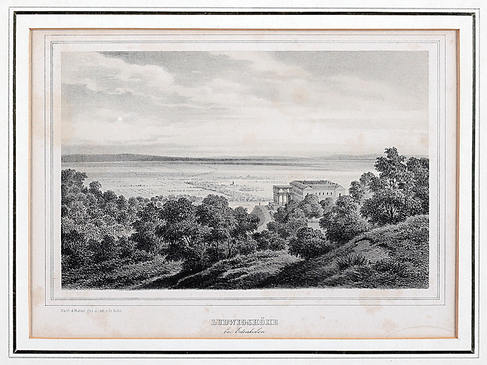 „Ludwigshöhe bei Edenkoben“. Auf Stein gezeichnet von F. Hohe. 14,6 x 22,6 cm. Stockflecken. Passepartout, vergl. R..