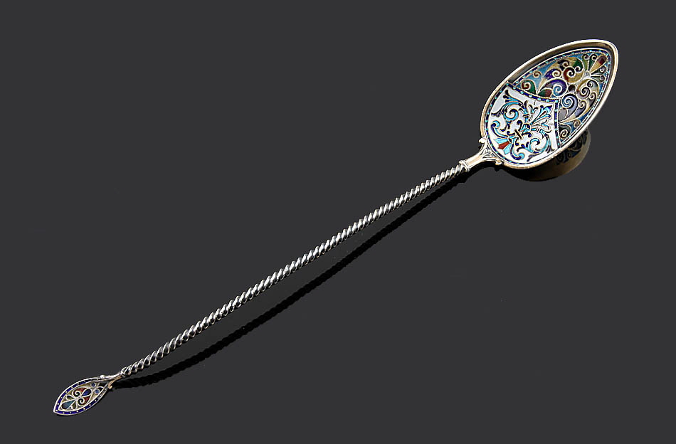 925er Silber. Langer, gedrehter Stiel. Laffe und Stielende mit feinem bunten, teils transparentem Cloisonné, am Stielende etwas fehlend. L 22,5 cm.
