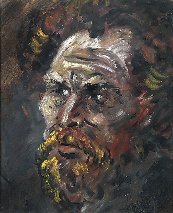 „Bildnis eines bärtigen Mannes“. Re. u. etwas unles. sign.. Öl/Papier, 60 x 49 cm. Vergl. R..