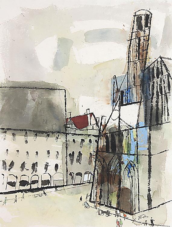 „Straßenszene mit Häusern und Kirche“. Re. u. etwas unles. sign.. Aquarell/Papier, ca. 56 x 42,5 cm (Bildausschnitt). Passepartout, vergl. R..