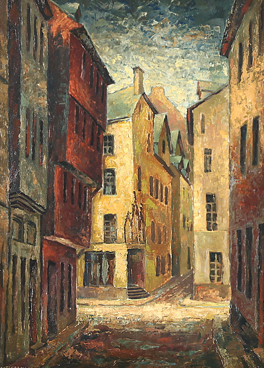 „Altstadtwinkel in Koblenz“. Li. u. sign. Melsbach, dat. (19)46. Öl/Holz, ca. 57,5 x 42 cm (Bildausschnitt). R..
