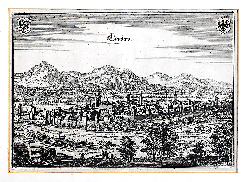 „Landaw“. Landau, Gesamtansicht. Kupferstich, 21 x 30 cm. Aus: Merian: Topographia Alsatiae, 1663. Passepartout, vergl. R..