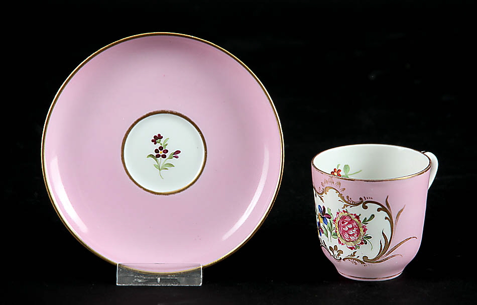 Potschappel, Manufakturstempel. Weiße und rosa Glasur, bunte Blumenbemalung, Golddekor. Tasse: H 5,7 cm, Untertasse: D 11,7 cm.