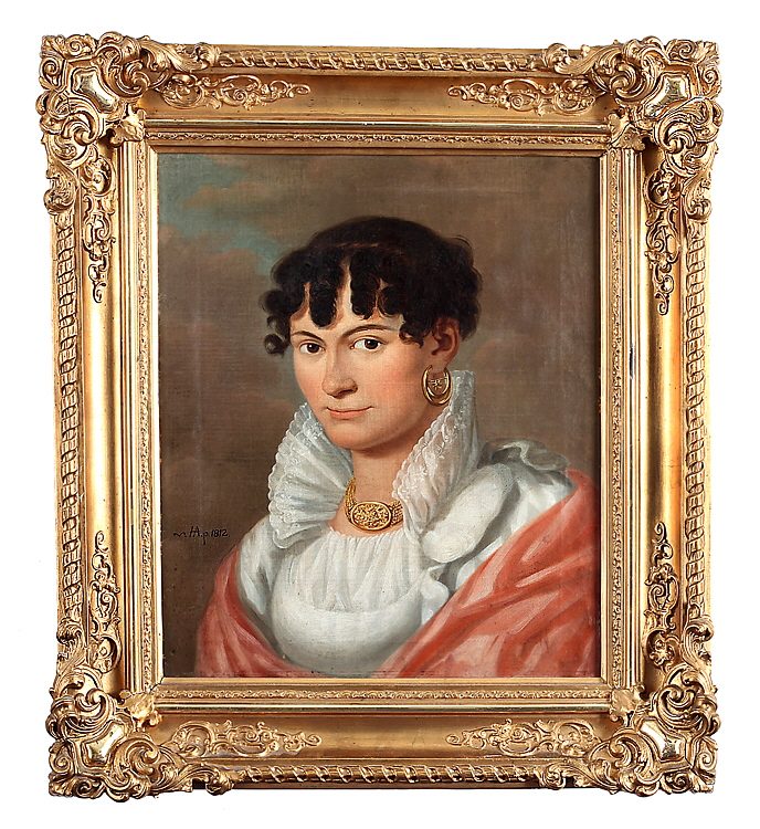 „Damenportrait“. Brustbild, nahezu en face. Li. u. sign. v. HA (ligiert), dat. 1812. Öl/Lwd., 47,5 x 39,5 cm. Vergoldeter Stuckr. aus der Zeit.