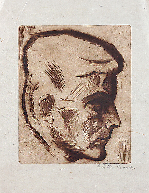 1881 Orupönen (Ostpreußen) – 1941 München; deut. Maler und Grafiker, Prof.. Studium an den Akad. in Berlin, Leipzig und Köln. Studienreisen nach Spanien, Südamerika und Italien. Mitglied im „Künstlerbund Westmark“. „Männerbildnis“. Radierung in Braun/Japanbütten, re. u. handsign. Müller Ewald. 23,8 x 19,5 cm. Bl.Ränder stellenweise knitterig.