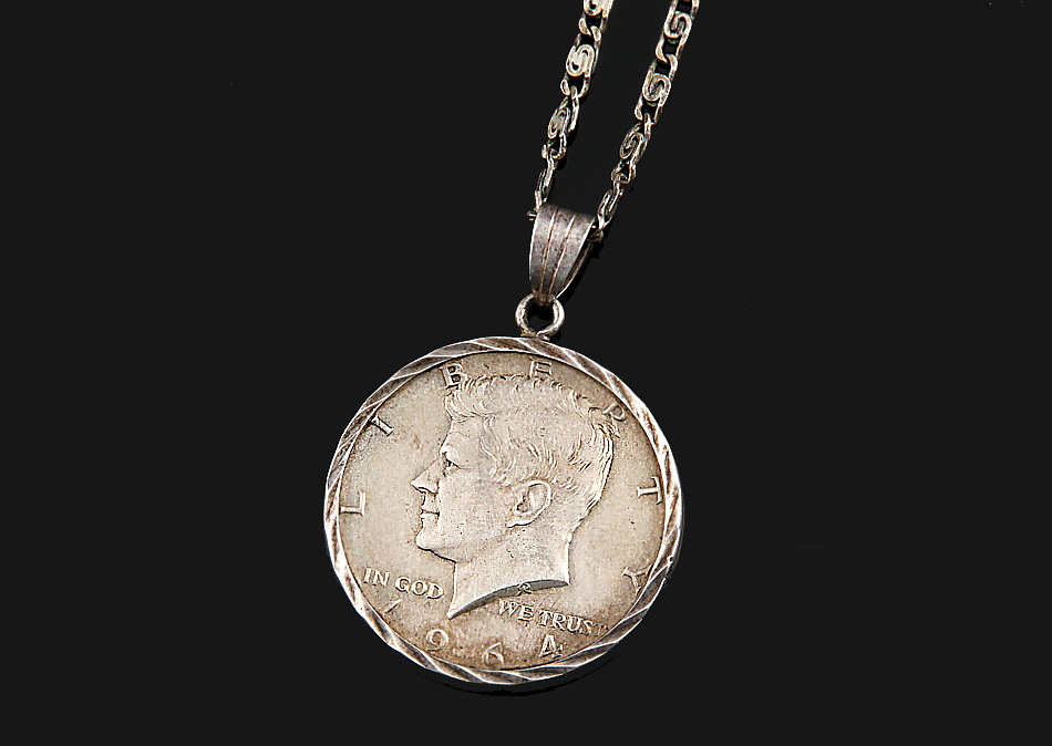 1/2 Silberdollar USA 1964 mit Bildnis J. F. Kennedy, in Silberfassung montiert. Jugendstilkette mit Ringösenschließe 925er Silber. Zus. 20,7 g.