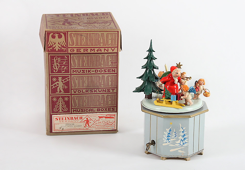 Deutsche Volkskunstwerkstätten, Hohenhameln. Bunt bemaltes Holzgehäuse, auf sich drehender Plattform geschnitzte, bunt bemalte Engelfiguren, Nikolaus mit Schlitten und Tannenbaum. Schweizer Spieluhr mit Lied „O Tannenbaum“. Stoppfunktion defekt. H ca. 23 cm. Partielle Farbabblätterungen. Orig. Pappschachtel.