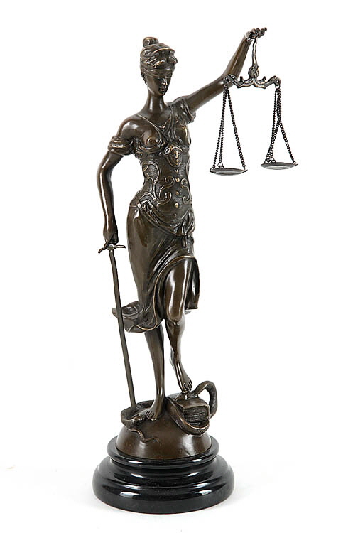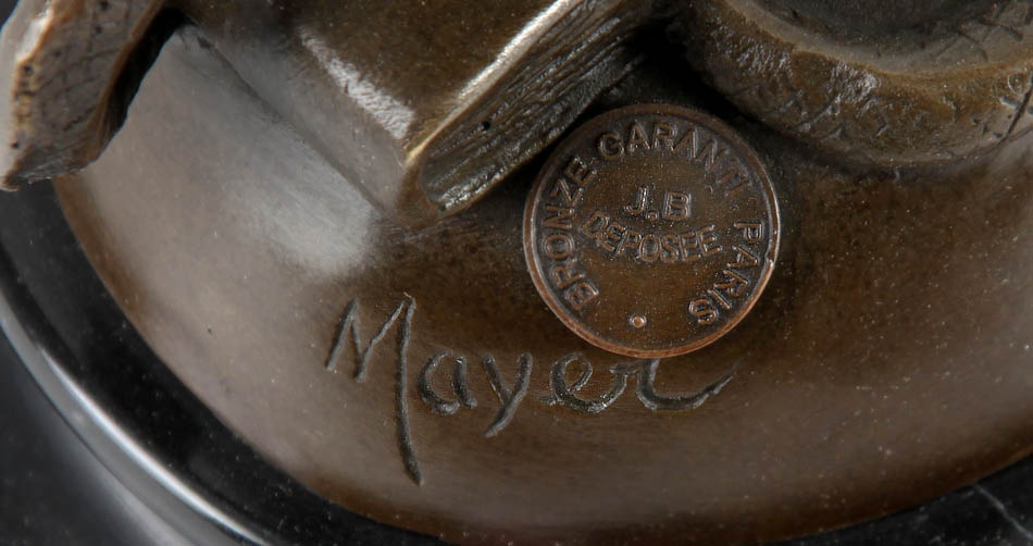 1855-1939. „Justitia“. Bronze, braune Patina. Auf der Plinthe bez. Mayer, darüber runder Reliefstempel: „BRONZE GARANTI PARIS J.B. DEPOSEE“. Runder, schwarzer Marmorsockel. H ohne Sockel 35,2 cm.
