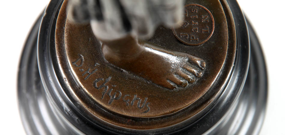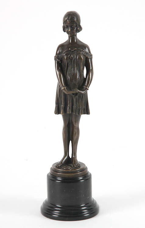1886-1947. „Mädchenfigur, stehend“. Bronze, braune Patina. Auf der Plinthe bez. D.H Chiparus, runder Reliefstempel: „JL Paris LN“. Auf dem Plinthenrand Nr. A-7 327. Runder, schwarzer Marmorsockel. H ohne Sockel 27,5 cm.