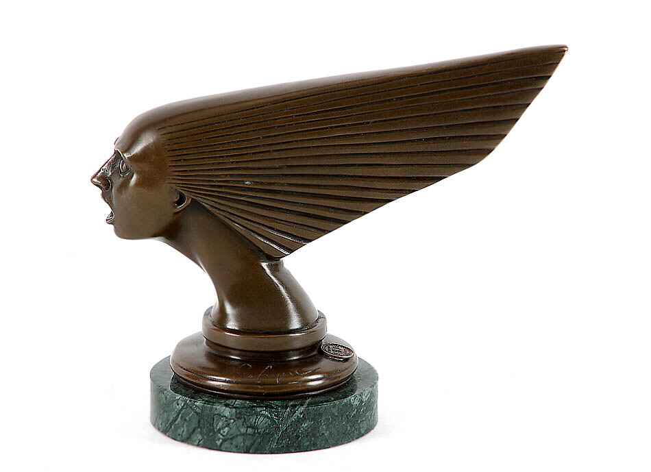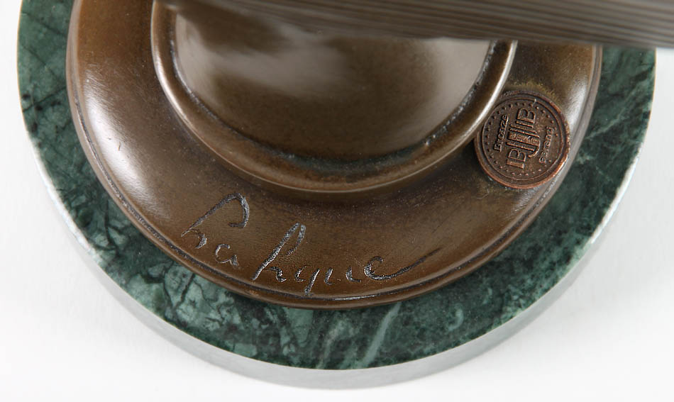„Spirit of the wind“. Bronze, braune Patina. Auf der Plinthe bez. La Lique, daneben runder Reliefstempel: „Bronze Garanti, BJB“, darüber: Nr. A 2467. Runder, grüner Marmorsockel. H ohne Sockel 15 cm.