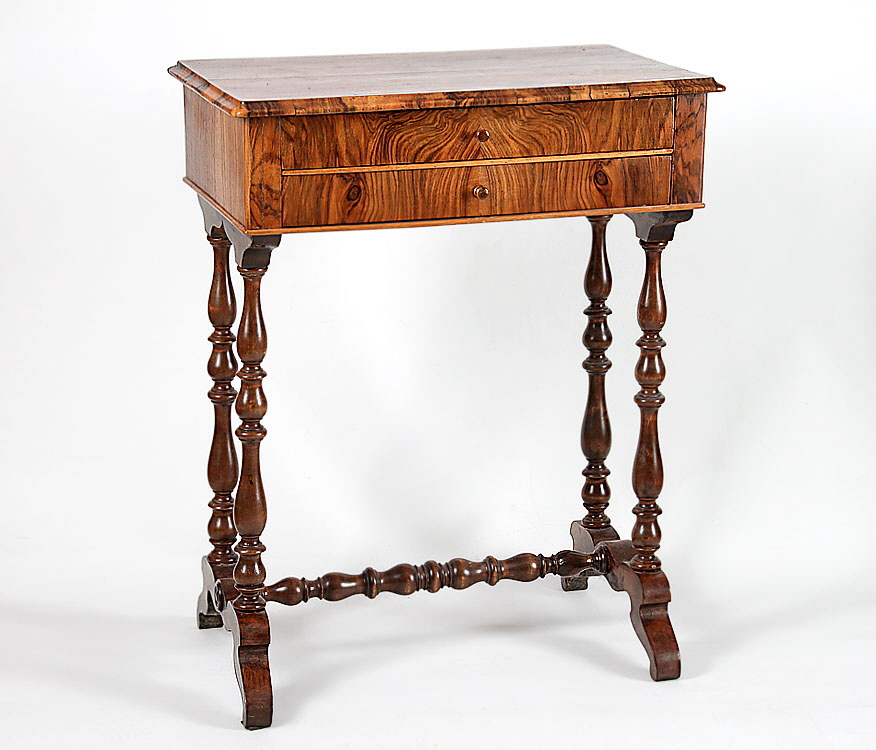 Deutsch, ca. Ende 19. Jh.. Nussbaum massiv und furniert, schön gemasert. Kasten mit zwei Schubladen, die obere mit Gefächern. Vier gedrechselte Beine unten mit Querstrebe, zwei ausgesägte Brettfüße. H 78,7 cm, L 62 cm, B 41 cm. Zustand B/C (Platte etwas altersrissig).
