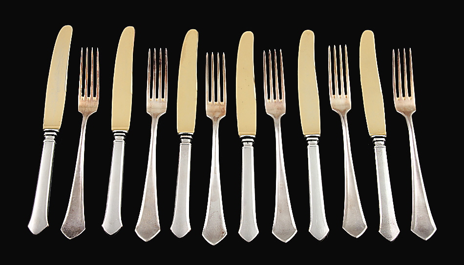 1. Hälfte 20. Jh.. 6 Gabeln, 6 Messer. 90er Versilberung, Stahlklingen vergoldet.