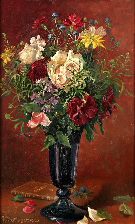 +1952; deut. Maler und Exlibris-Künstler. „Stillleben mit Blumenvase und Buch“. Li. u. sign. R. Oeffinger, dat. 1925. Öl/Karton, 43 x 27,5 cm. R..